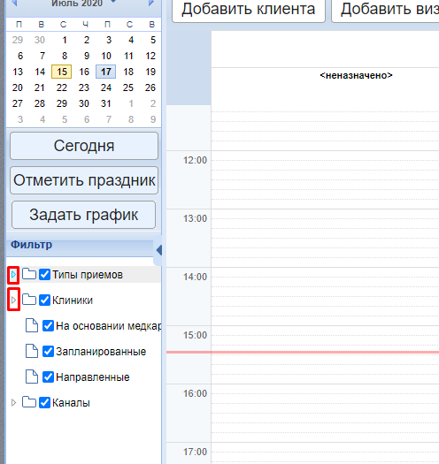 Если запись создали, но не видите ее в календаре, нужно проверить фильтры модуля. Для этого слева открываем каждый фильтр и проверяем, стоят ли галочки. Если галочка не стоит — нужно ее проставить.