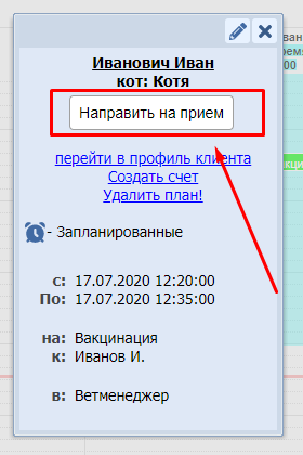 Когда клиент по запланированной записи приходит в клинику, нужно его найти в Календаре и направить на прием. Для этого кликаем по записи и жмем Направить на прием.