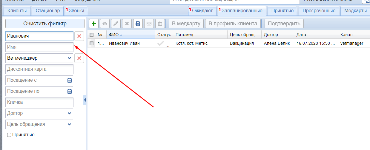Такой клиент попадает во вкладку Ожидают. Это означает, что он уже в клинике, находится в очереди. Когда клиент переходит к врачу, врач или администратор должны поменять его статус на У врача.