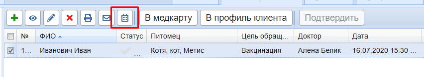 Визит можно запланировать через кнопку планирования в виде календарика (см. картинку). Эта кнопка есть в модуле Управление клиентами, в профиле клиента, в медкарте.