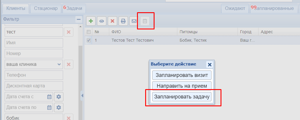 Посмотреть задачи можно будет из вкладки Задачи в Управлении клиентами. Также создана отдельная вкладка Задачи в профиле клиента. Здесь видно тип (звонок или задача), исполнителя, срок, клинику и примечание.