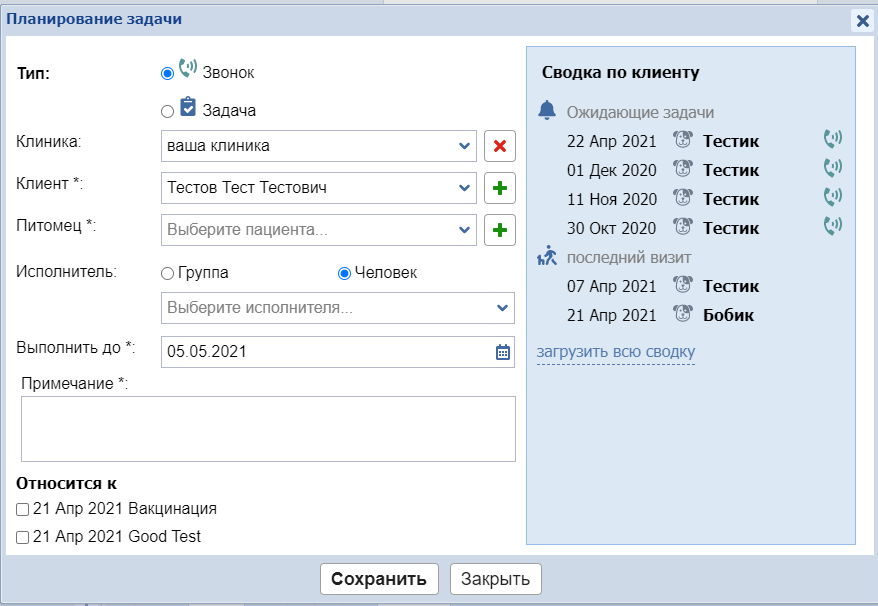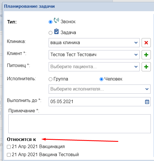 Относится к: здесь будут отображаться последние приемы и вакцинации, к которым можно привязать данную задачу.