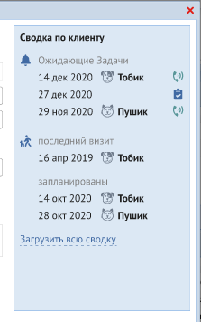 Информация о запланированных звонках и задачах отображается в сводке по клиенту вместе с запланированными визитами и вакцинациями.