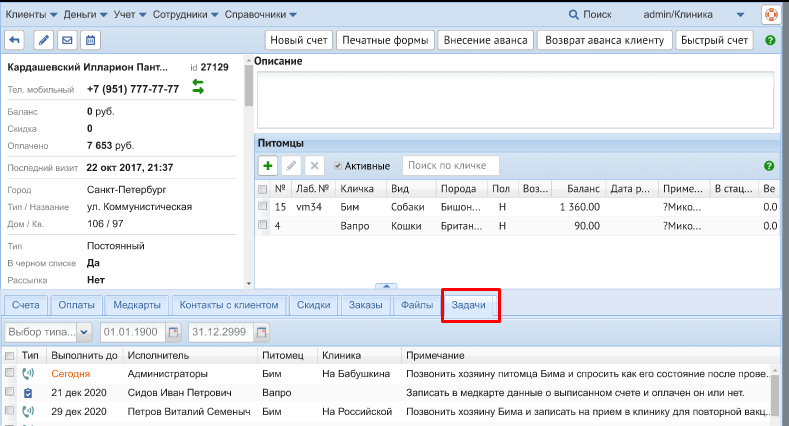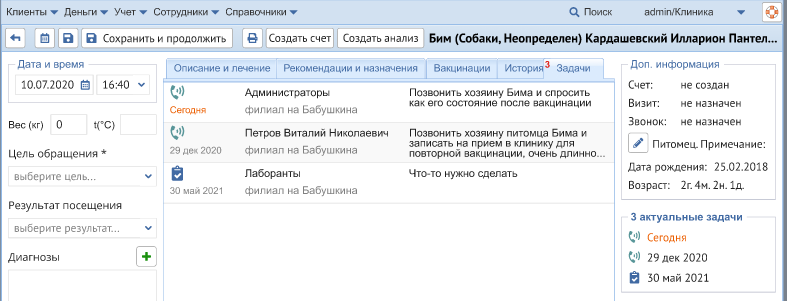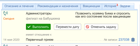 Например, провели операцию и нужно перезвонить и узнать самочувствие питомца. При создании звонка или задачи отмечаем галочкой прием, на котором была проведена операция. Ответственный сможет посмотреть медкарту с этого приема, уточнить нужную информацию.