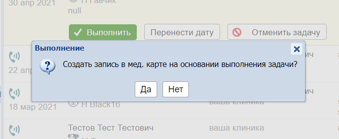 Например, нужно ли создавать медкарту при выполнении задачи. Это делается в Настройки - Управление клиентами - вкладка Задачи/Звонки.