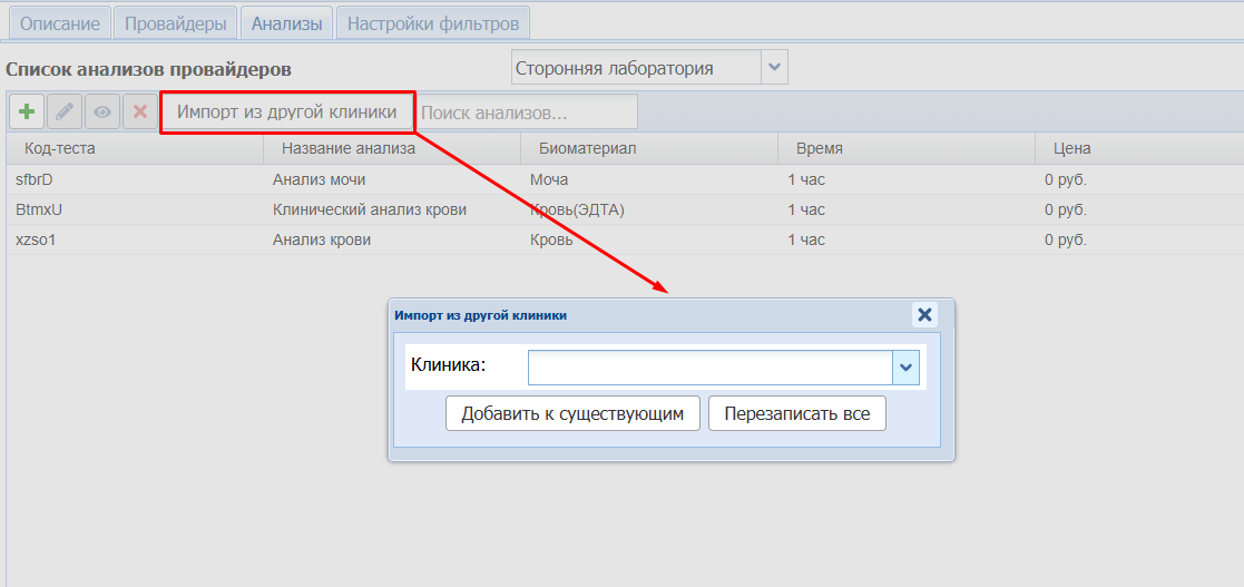 Если у вас сеть клиник и во второй клинике тоже планируется работа с модулем "Лаборатория", нужно перейти во другой филиал и там тоже все настроить. Во вкладке "Анализы" можно воспользоваться кнопкой "Импорт из другой клиники".