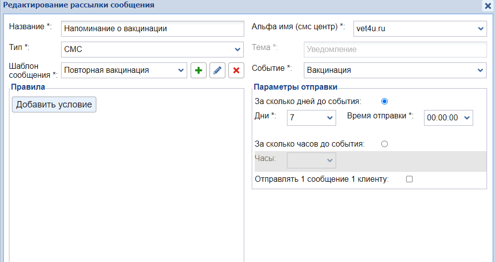 • отправить смс клиенту с напоминанием о необходимости повторной вакцинации питомца