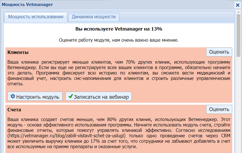 Мощность Ветменеджер — это точно такой же показатель. Для какой-то клиники работа и при 13% будет комфортной.