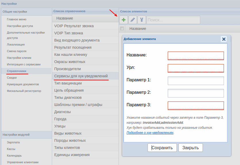2. В настройках Ветменеджера перейдите в раздел Справочники -> Сервисы для хук-уведомлений -> Добавить. Заполните поля и нажмите кнопку «Сохранить».