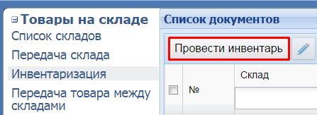 Перейти Учет - Склад - Инвентаризация и нажать кнопку Провести инвентарь