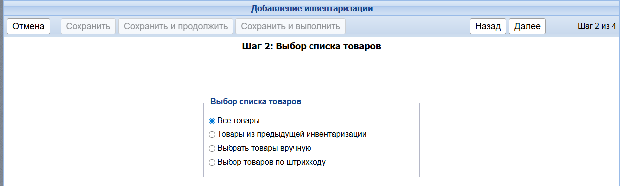 Если нужно провести полную инвентаризацию, выберите пункт Все товары и нажмите кнопку Далее.