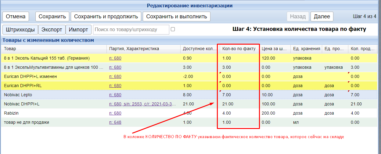 Колонка «количество по факту» редактируемая — именно здесь вы проставляете фактическое количество товара, которое на данный момент на складе.