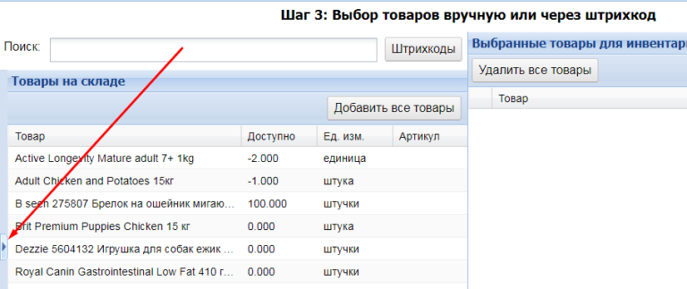 Иногда нужно исправить количество только одного товара. В таком случае выбираем вариант Выбрать товары вручную. Далее в поле поиска вводим название нужного товара (одного или нескольких).