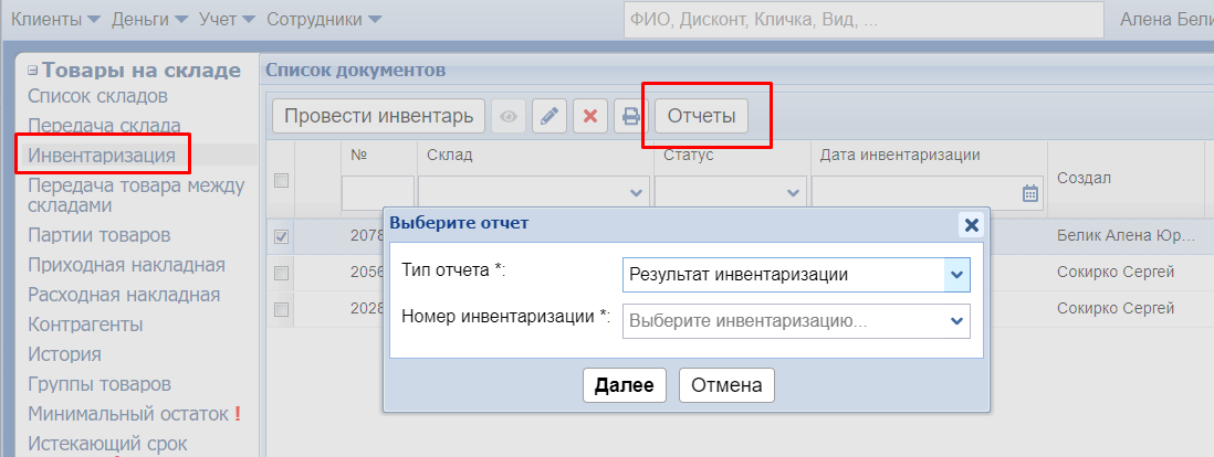 В открывшемся окне выберите склад, по которому проводите инвентаризацию, и нажмите кнопку Далее.