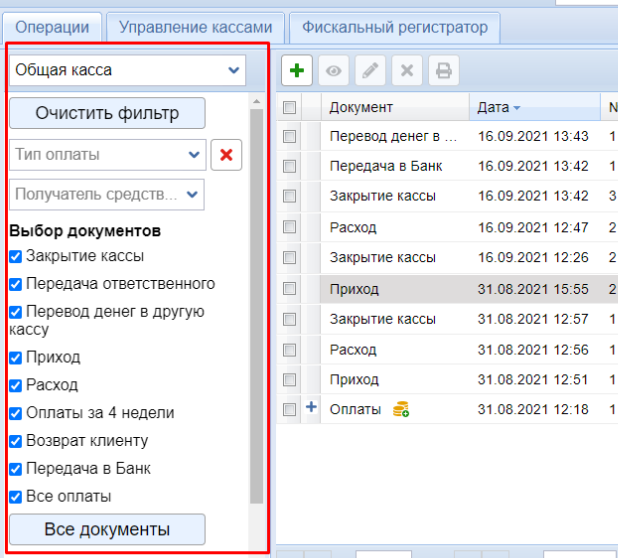 В центральном окне будут отображаться операции по кассе в соответствии с выбранным фильтром.