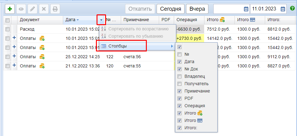 А также кнопка Отката документа и фильтр по датам, за которые нужно просмотреть операции.