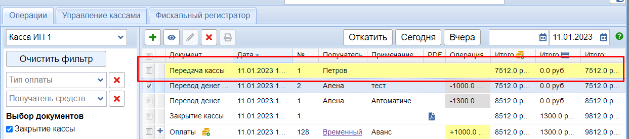 Пример: на скриншоте строка Передача кассы выделена желтым. Это означает, что кассу передали сотруднику, но он ее не принял. То есть документ не проведен. Сотрудник Петров должен зайти в программу, перейти во вкладки Операции, кликнуть по этой строке и подтвердить передачу кассы, введя свой пароль.