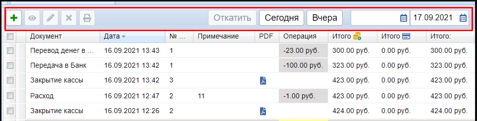 Во вкладке Операции сверху расположены кнопки для добавления новых документов в кассу, просмотра, редактирования, удаления и печати.