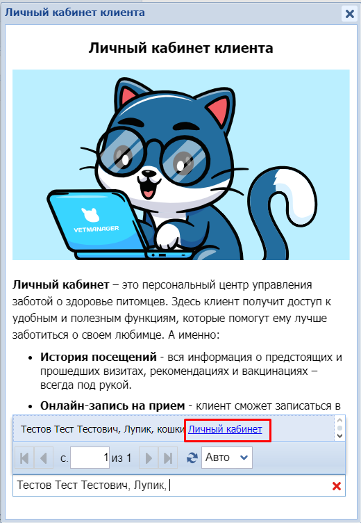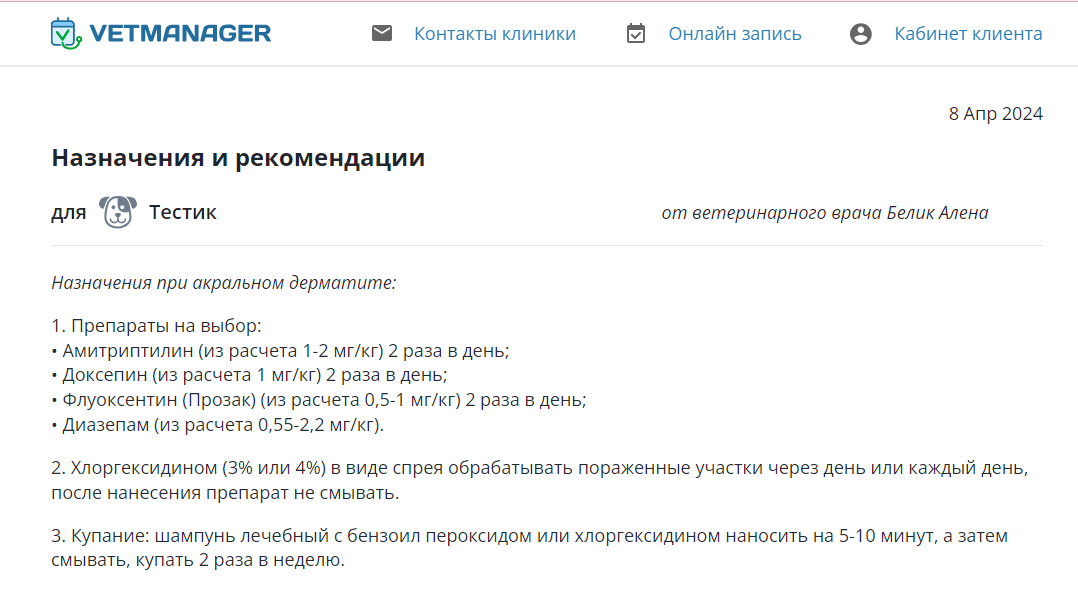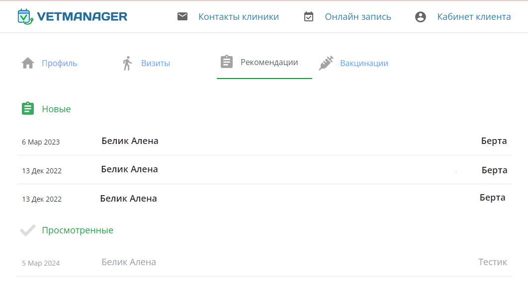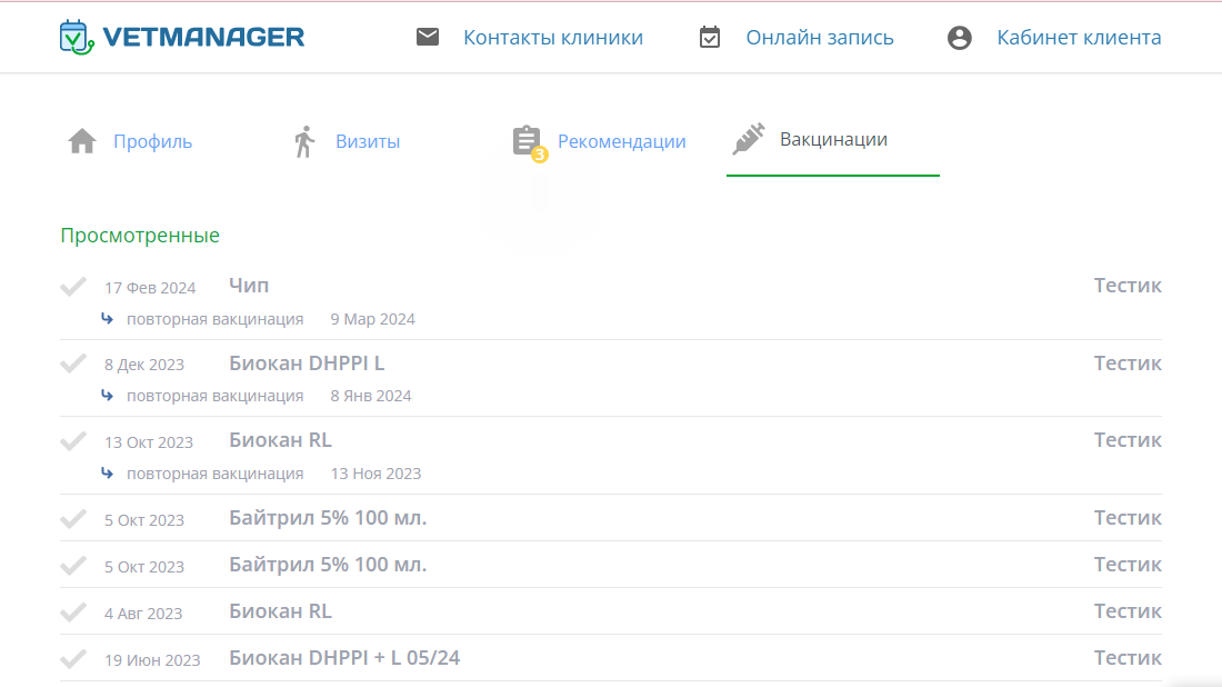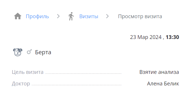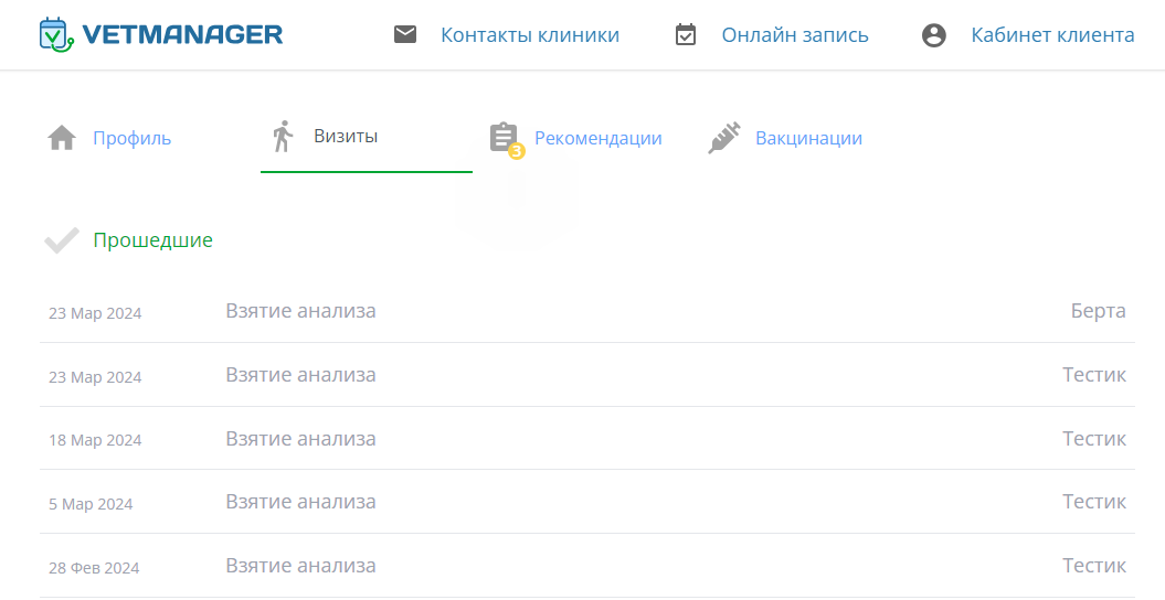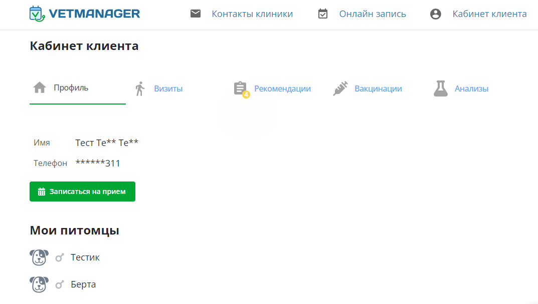 Личный кабинет клиента - это сервис, с помощью которого клиенты клиники могут просматривать свои прошедшие/запланированные визиты в клинику, рекомендации, следить за вакцинациями своего питомца, записаться онлайн на прием.
