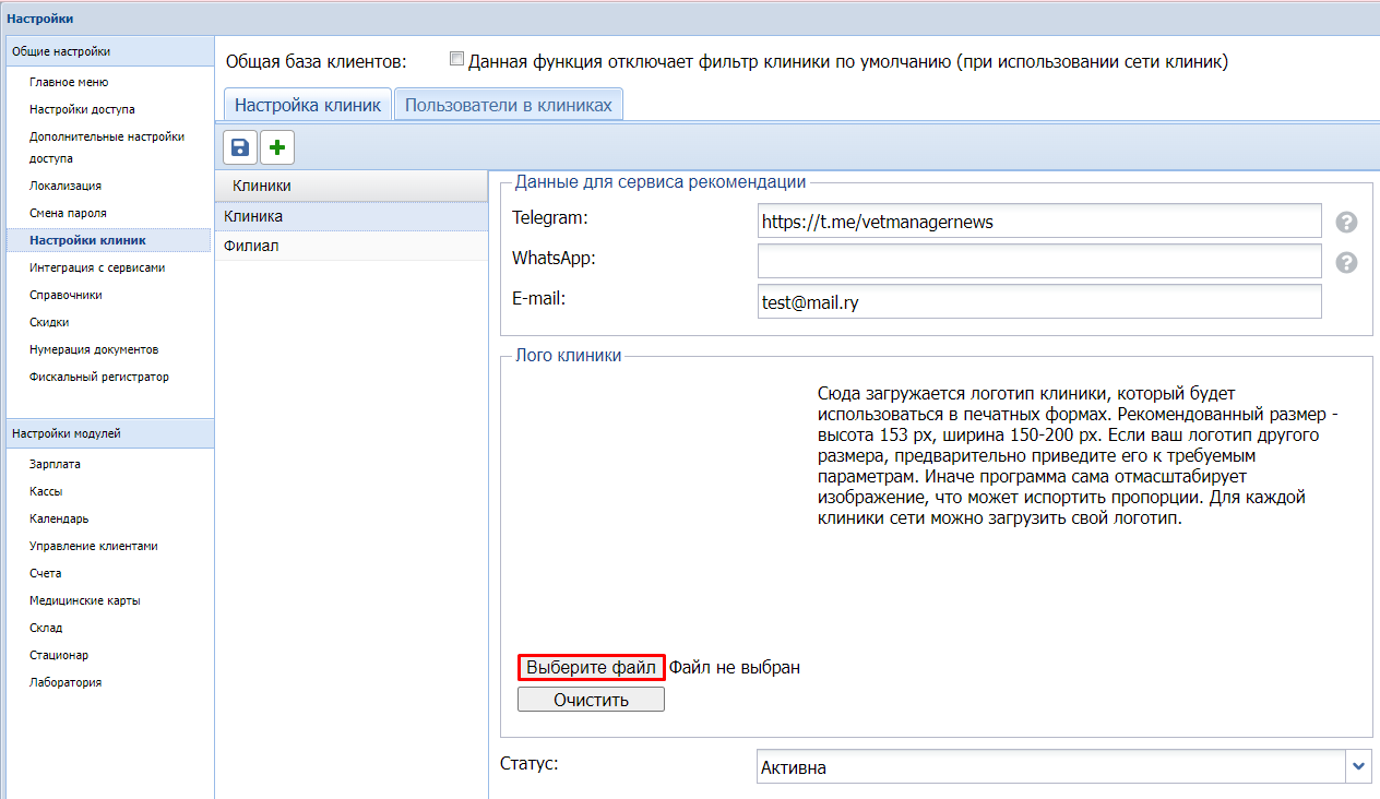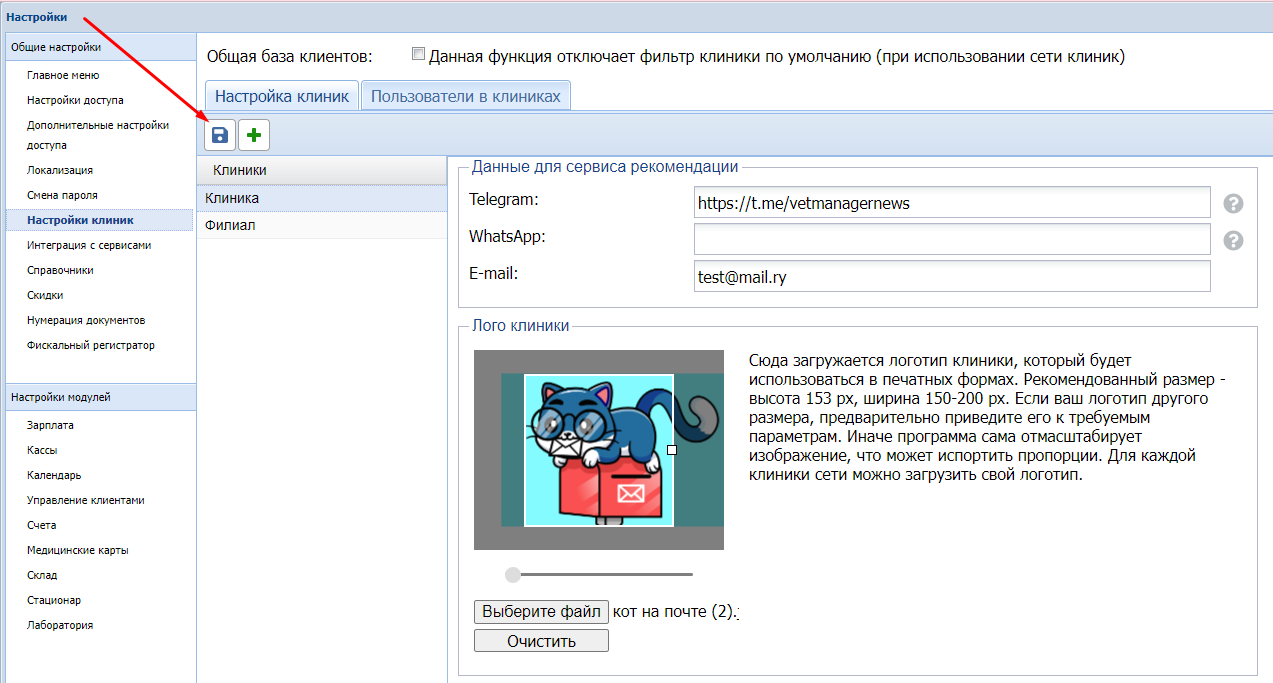 В верхнем левом углу личного кабинета можно отобразить логотип вашей клиники. Для этого он должен быть добавлен в настройках программы Ветменеджер. Перейдите в Настройки - Настройки клиники - выберите филиал и в разделе "Лого клиники" нажмите "Выберите файл".