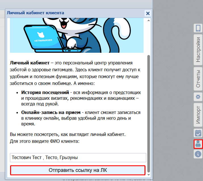 Вы можете проверить, как выглядит ЛК любого вашего клиента. Для этого нажмите на боковой панели справа кнопку "Личный кабинет".