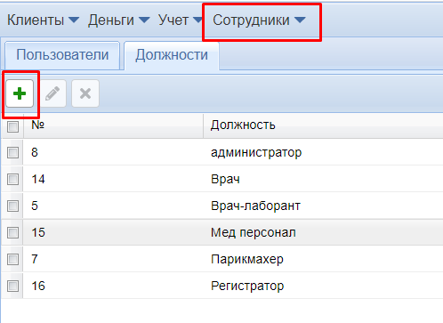 Должностями в программе можно управлять в модуле Управление сотрудниками, во вкладке Должности. Чтобы добавить новую должность, нужно нажать кнопку Добавить (+)