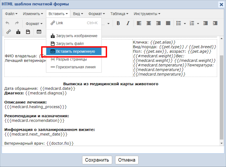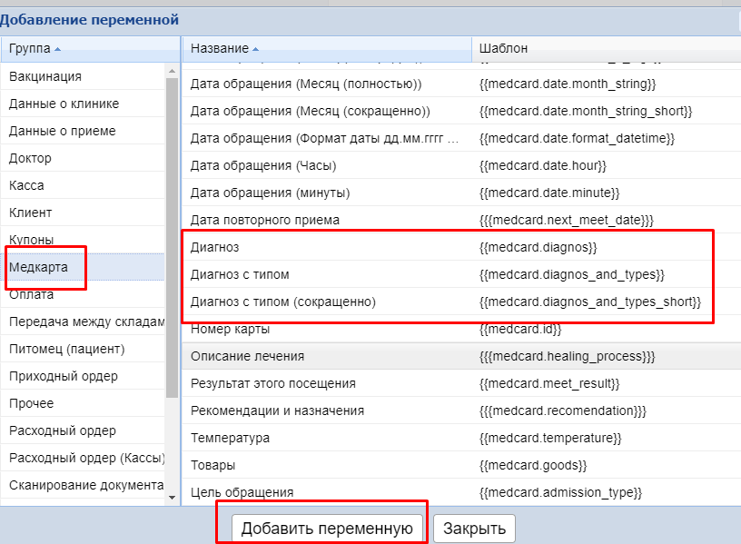 Например, нам нужно добавить диагноз в распечатку медкарты. В нужном месте пишем слово Диагноз и вставляем переменную из группы Медкарты (выбираем подходящий вариант из трех: просто диагноз, диагноз с типом и диагноз с типом сокращенно).