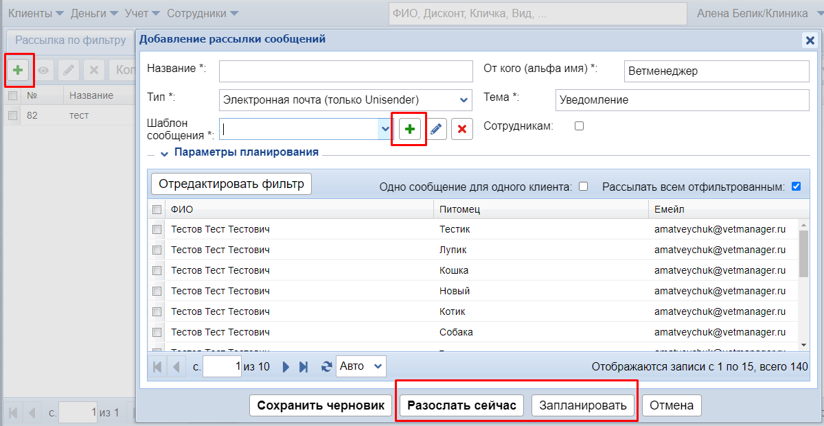 Если же поставить галочку Рассылать всем отфильтрованным, то галочки с выбранных клиентов будут сняты и рассылка будет производиться для всех клиентов в отфильтрованном списке.