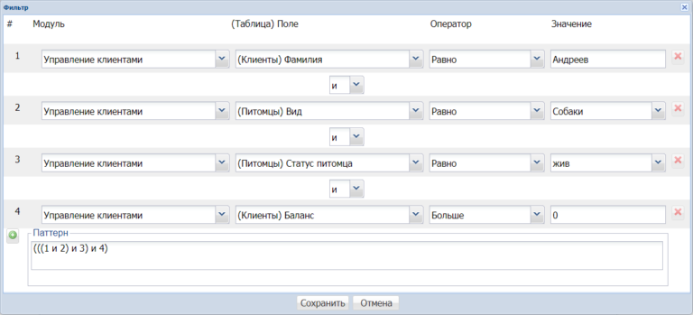 Поддерживаются всевозможные варианты фильтрации по всем модулям, содержащим информацию о клиентах и питомцах. Например, можно отфильтровать клиентов с фамилией Андреев с питомцами-собаками из города Москва, у которых баланс больше нуля.