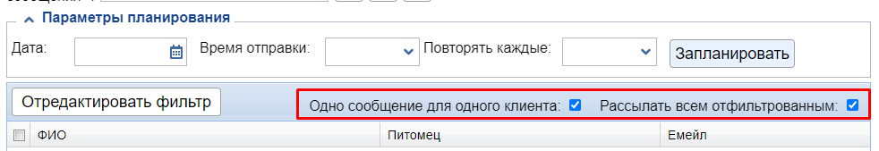 Если у одного клиента несколько питомцев, то ему может прийти несколько сообщений. Чтобы этого не случилось, поставьте галочку Одно сообщение для одного клиента (сообщения разделяются на количество питомцев, только если в фильтре указан питомец).
