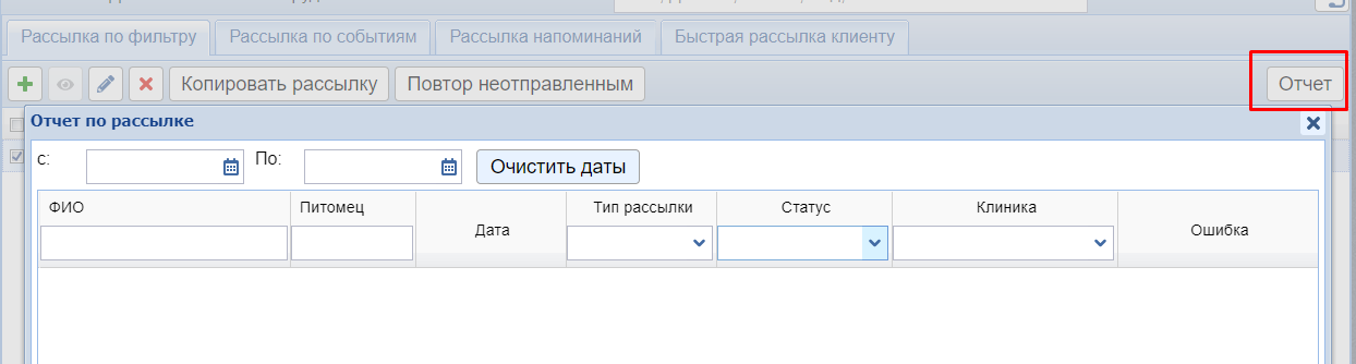 Чтобы просмотреть отчет об отправленных напоминаниях, выделите интересующую рассылку и нажмите кнопку Отчет. Его можно фильтровать по датам, типу рассылки, статусу и так далее.