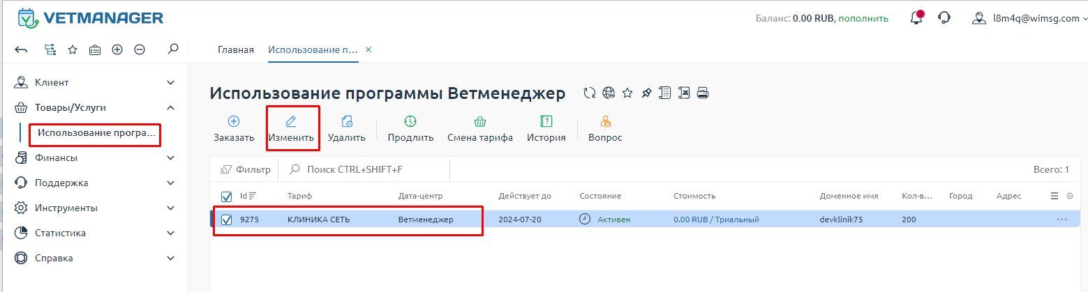 Далее в биллинге в разделе Использование программы выделите строку с вашим тарифом и нажмите Изменить.