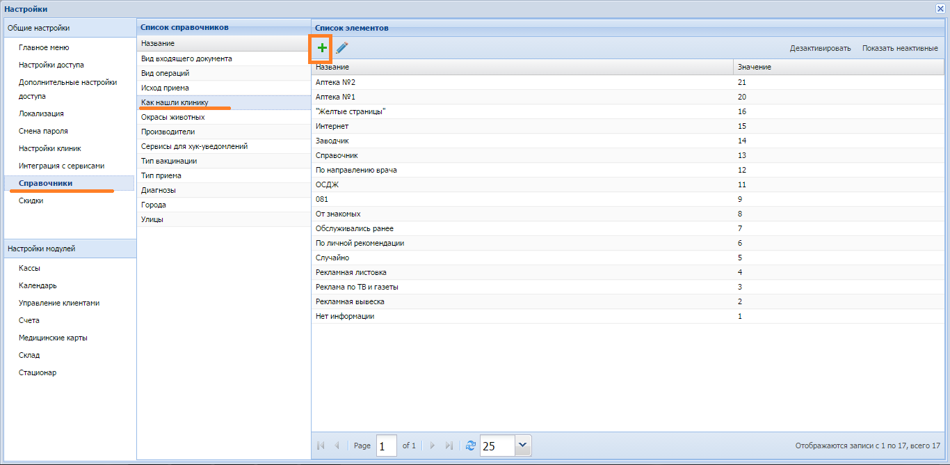 Для начала переходим в настройки программы, выбираем раздел Справочники и выделяем справочник Как нашли клинику, затем добавляем всех своих партнеров, которые направляют клиентов в клинику.