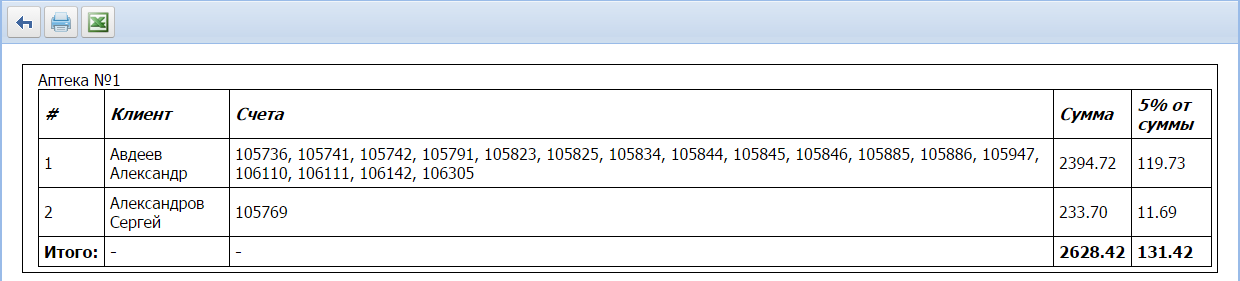 В результате видим такую таблицу с суммой по каждому клиенту, перечнем счетов и суммой вознаграждения для рекомендовавшего вашу клинику.