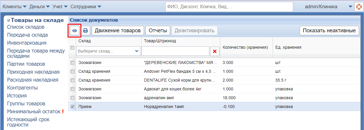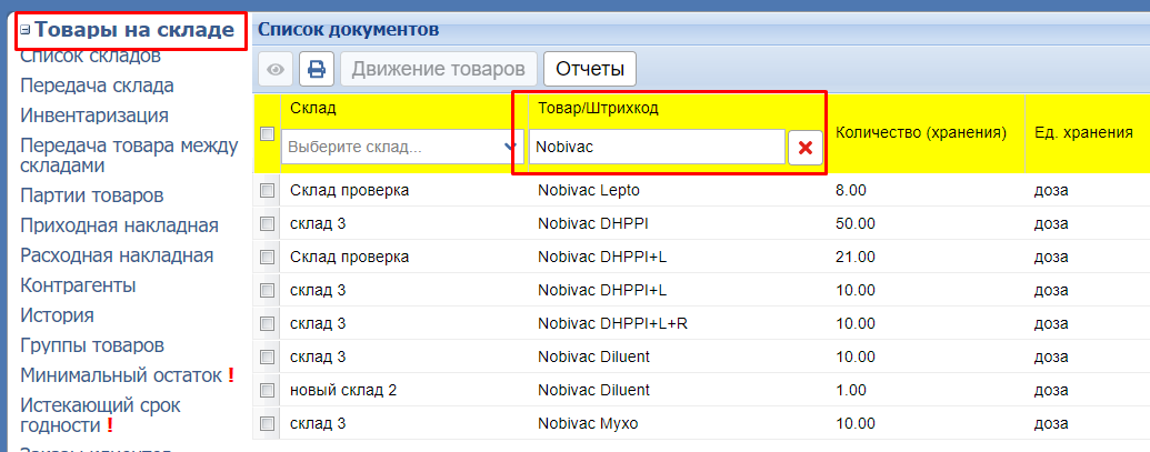 В этом разделе отображаются наличие всех остатков на различных складах текущей клиники. Можно отсортировать по складу и в поле поиска ввести название конкретного товара и посмотреть его остаток.
