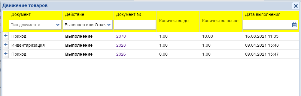Выделив товар и нажав кнопку Движение товара, можно посмотреть детали: когда товар приходил на склад, списывался в счетах, проводилась инвентаризация и так далее. Таким образом можно посмотреть историю по конкретному товару и понять, что и когда с ним происходило.
