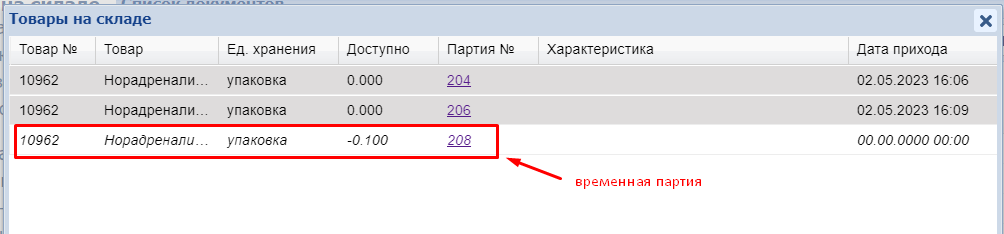 Как она появляется? Если при проведении инвентаризации в поле “Количество по факту” указать 0, будет создана временная партия по этому товару с количеством 0. С ней можно работать, как с обычной партией, и списывать товары через счета. При создании приходной накладной строка с товаром во временной партии обнуляется и деактивируется.