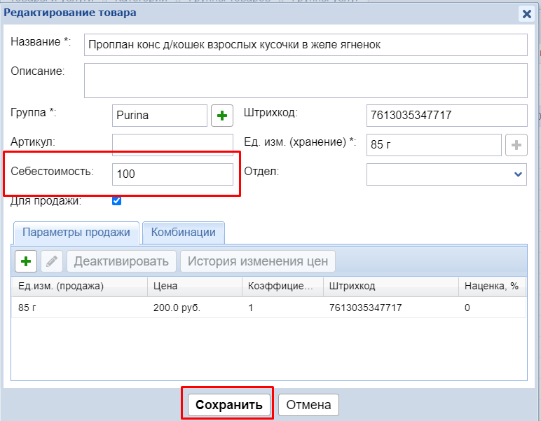 Себестоимость. Как изменить себестоимость в товаре/услуге
