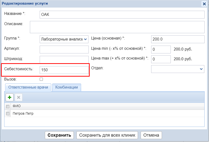 Можно установить себестоимость услуги. Например, если клиника пользуется услугами сторонней лаборатории для проведения анализов, можно в карточку услуги прописать себестоимость - то есть стоимость проведения данного анализа в сторонней лаборатории; в поле Цена - указать свою цену.
