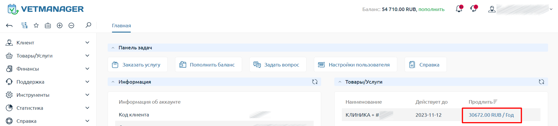 При переходе в платежный кабинет (биллинг) вы попадаете на главную страницу.