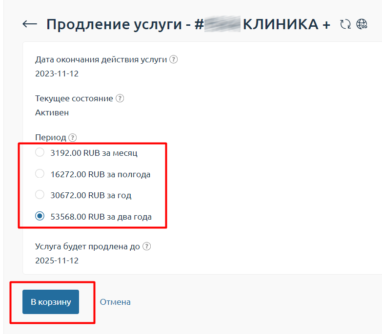 Выберите период продления подписки (на месяц, полгода, год или два года) и нажмите В корзину