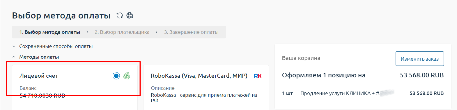 Выберите способ оплаты: Лицевой счет