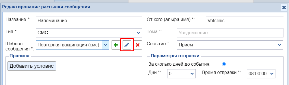 В модуле Шаблоны сообщений найдите нужный, чтобы его отредактировать. Это также можно сделать из самой рассылки (модуль Рассылки), нажав на карандаш напротив шаблона сообщения.