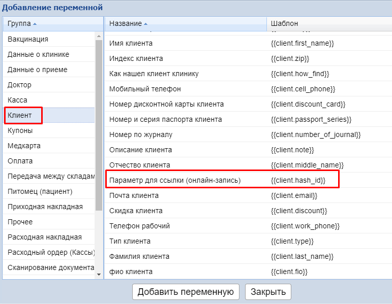 Чтобы данные клиента подставлялись автоматически при онлайн-записи, необходимо в ссылку онлайн-записи добавить параметр клиента. Для этого откройте переменные и из модуля Клиенты и добавьте переменную Параметр для ссылки (онлайн-запись).