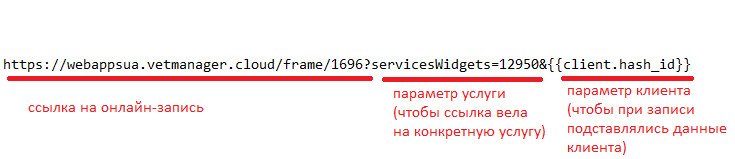 • далее параметр конкретной услуги (как настроить онлайн-запись на конкретную услугу, описано здесь): servicesWidgets= (уникальный код услуги) (это не обязательно; нужно только в случае, если вы хотите сделать ссылку на конкретную услугу)