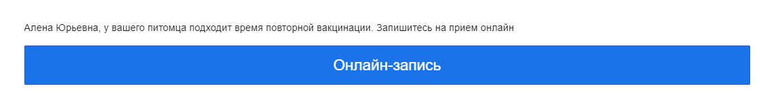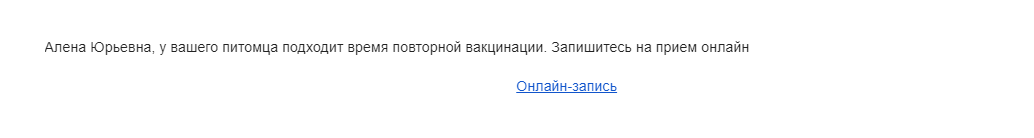 В рассылку с напоминанием о повторной вакцинации добавьте ссылку на онлайн-запись, что позволит клиенту быстрее и легче записаться на прием. А в ссылку добавьте параметр клиента, чтобы при заполнении онлайн-формы автоматически подставились его данные из базы (ФИО, телефон и кличка питомца).