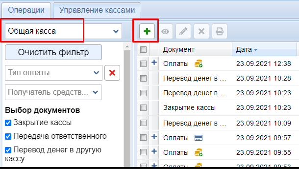 Для этого перейдите в модуль кассы, вкладка Операции, выберите в фильтре необходимую кассу и нажмите на кнопку добавления документа (зеленый плюс)