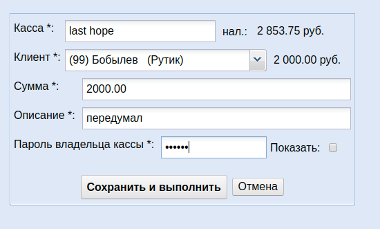 В программе есть возможность вернуть деньги с баланса клиенту без печати чека в фискальном регистраторе.