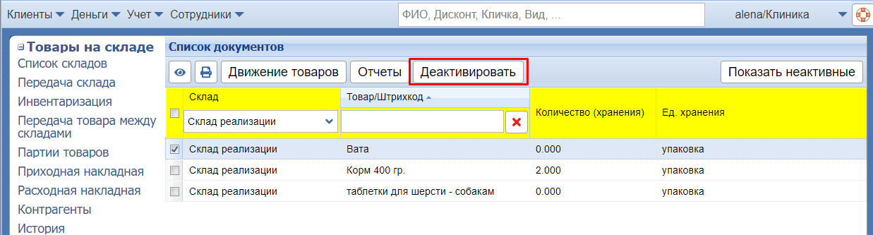 ВАЖНО! Деактивировать можно только товары с нулевым остатком. Если остаток не нулевой и есть какая-то партия товара с положительным остатком, необходимо предварительно провести инвентаризацию по этим товарам и выставить количество по факту 0.