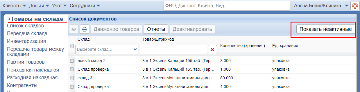 Посмотреть товары, которые были удалены со склада, можно через кнопку Показать неактивные, которая находится в этом же разделе.